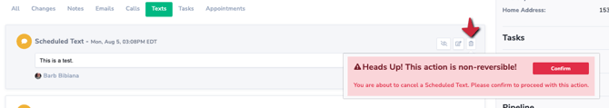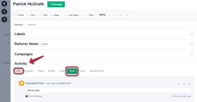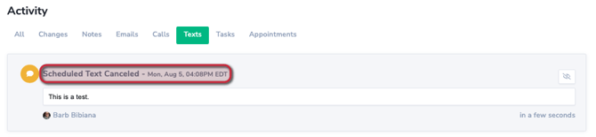 - In the Activity timeline under the ALL tab or TEXT tab find the scheduled text