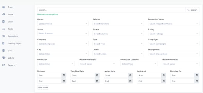 Search is great when you need to find a specific lead; most of the time, you'll be narrowing your audience for bulk email, smart campaigns, or laser-focused cold calling. Under the Search bar, click Show Advanced Options.