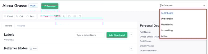 Onboarding is where agents will show up after they've been marked Signed in Recruiting. This way, you can easily track an agent who's yet to complete training, paperwork, or other initial steps to join the brokerage.