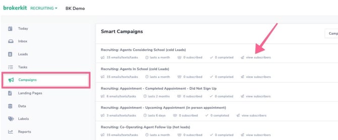 If you are uncertain about the number of contacts assigned to a campaign, you can easily check this information. Simply navigate to the campaigns page using the menu on the left, which is available in both the Recruiting and Retention sections. Click on the arrow labeled view subscribers to continue.